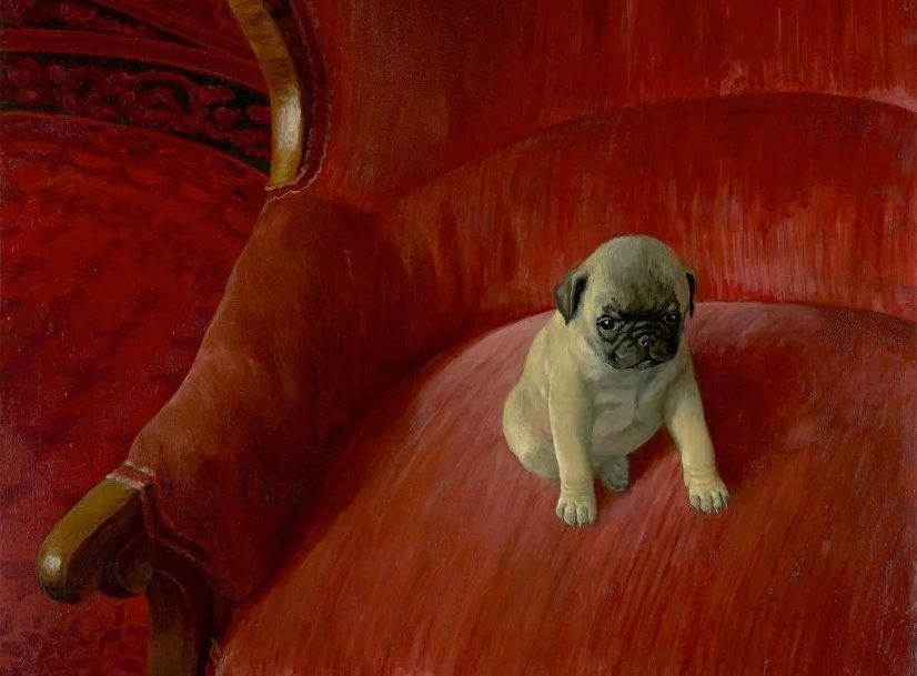 OK, we love cats but we also like dogs, especially melancholic ones. Not much is known about this painting. As we can see, it offers a lonely pug sitting on a beautiful red armchair. Maybe he is waiting for his master or dreaming about going for a walk. His name is Siegfried, which sounds like the best possible name for him.