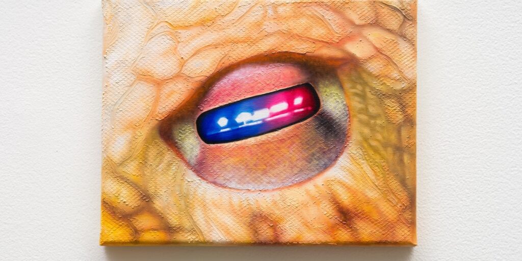 Similarly confrontational, ten small paintings of cephalopod eyes convey eerie feelings of being watched. According to the press release, part of the impetus for this series, titled “Espejitxs” (Little Mirrors), 2021–, was the artist’s recognition of esoteric connections between her father’s emigration from Chile, migrations of the Humboldt squid that he studies as a biophysicist, and the similarities between the creature’s nerve-cell impulses and fiber-optic cables. If Correa’s sculptures dredge up what would otherwise remain unseen, these paintings celebrate the protective power of camouflage. Executed in oil and modeling paste on linen, they sport varying high-key palettes, referencing chromatophores allowing the squid to blend into their environments by dynamically changing color. Inside each eye is a glowing motif evoking man-made technologies of surveillance and control, such as a camera lens in Espejito VIII: Interruptór (Little Mirror VIII: Switch), or a police vehicle’s light bar in Espejito IX: Gritting My Teeth, both 2023. Encrusted textures surround the smoothly painted ocular interior, further making them seem like portals into other worlds. All these fantastical devices add up to a sci-fi effect, as though the animals were bionic hybrids returning our gaze in silent reflection on humanity’s deleterious activities.