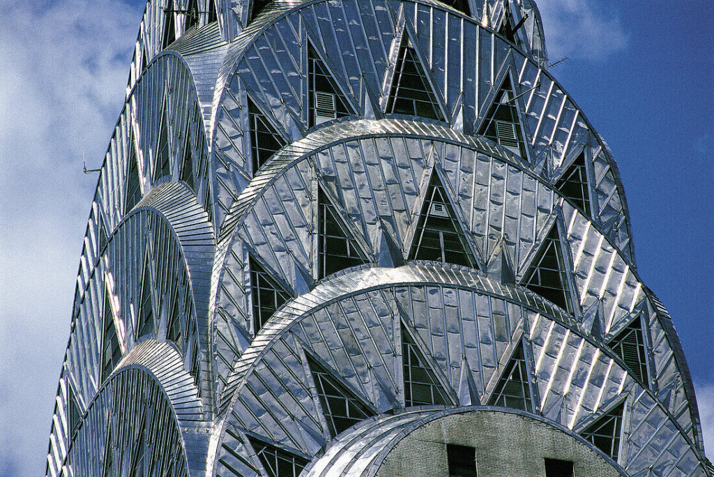 While one can appreciate Art Deco architecture from street views, it is when visiting the buildings’ lobbies that their abundant motifs truly shine. The terraced crown and hood ornament gargoyles of the Chrysler building are iconic, and its triangular lobby, ceiling murals, and elevator doors are equally memorable. Meanwhile, the lobby of the Empire State Building boasts an energetic zigzagging tile design on the floor leading to an aluminum relief of the building with rays of light emanating from behind.