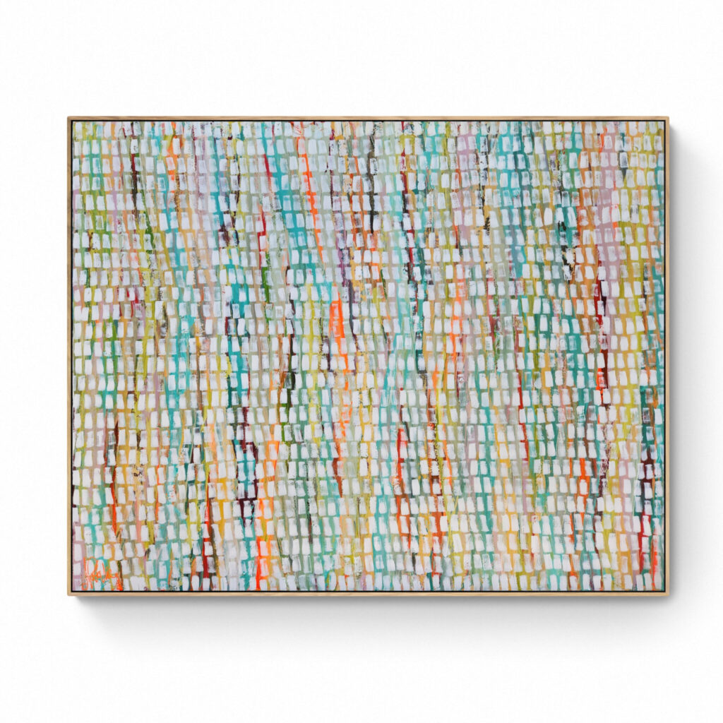 Sometimes the colors mix on the brush or as they hit the canvas, sometimes the layering of dryer paints allows multiple colors to shine through and mix as the light hits them. This causes the paintings to shift and change as you move around the work, a stunning trait which makes them ideal for open concept living where you need something that can be enjoyed from multiple views. Even with the layers upon layers of color, her pieces still have a very calm and serene sense of movement, like swaying or shimmering leaves in the wind.