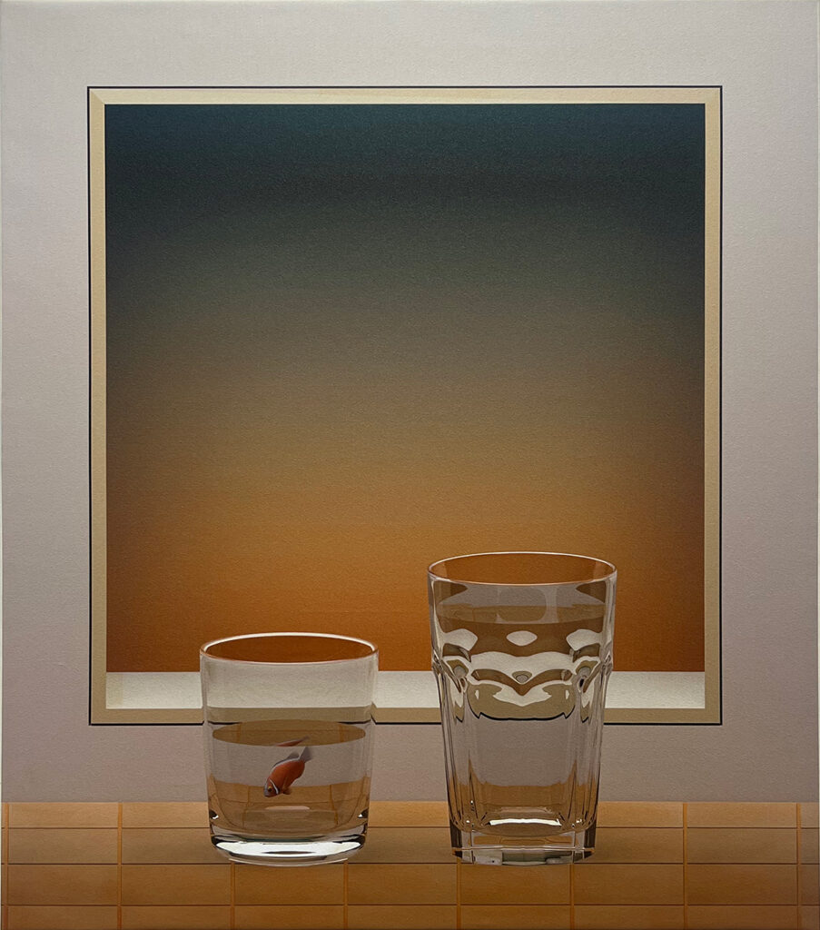 In addition to her thematic explorations, Wright’s paintings are an exercise in technique: “the paintings mimic the machine-made quality of an architectural rendering through isometric posturing and seamless textures. The digital seeming representation latently supports the agenda around indifference and presentation. Every detail is examined equivocally. Groupings and relationships between objects are rendered non-hierarchically as- they become blatantly arbitrary with uncanny relationships with their surroundings and contexts.”