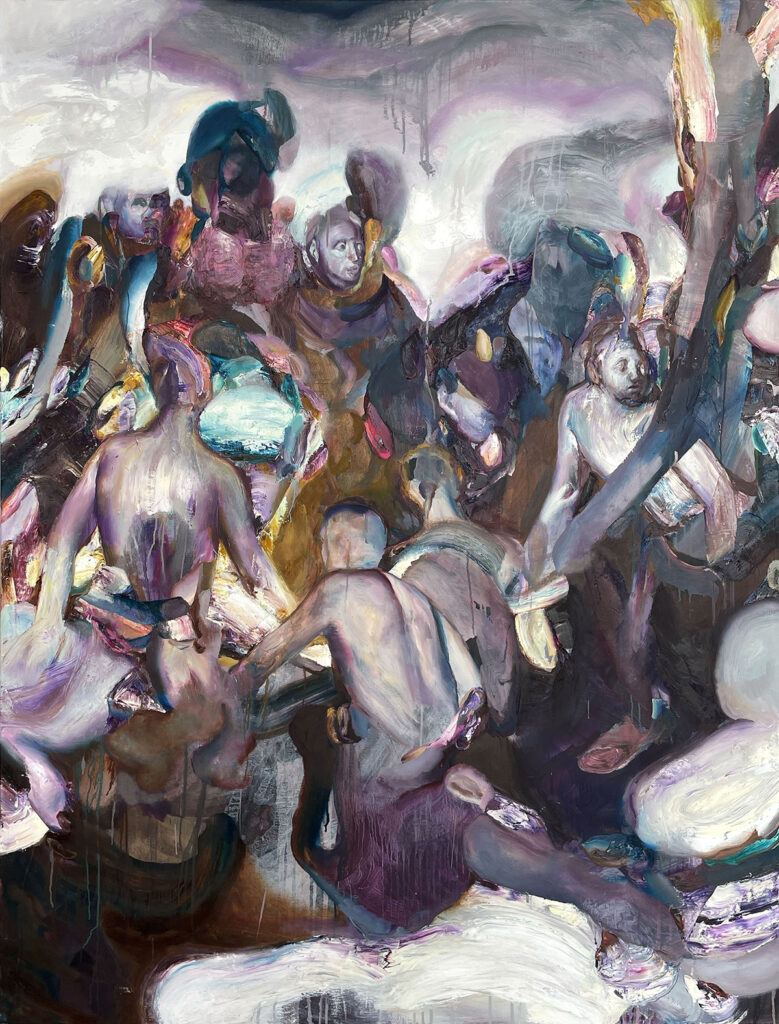 A selection of paintings by German artist Jakob Scheidt. Born in Schwäbisch Gmünd, and currently based in Hamburg, Scheidt depicts complex scenes that thrive on the juxtaposition of extremes. Forms appear darkly condensed and knotted together, emerging from tangled background structures and coming to the foreground through the use of light tones. His artistic process involves both deconstruction and reconstruction with the remnants of certain motifs serving the formation of new inventions. Drawing on diverse art-historical and literary references, Scheidt attempts to address contemporary issues of collective guilt and responsibility. A wide variety of sources serve as source material including memories and photo fragments from news reports or archives. The result is a series of suggestive scenes that resist clear categorization and cannot be reduced to a single narrative.