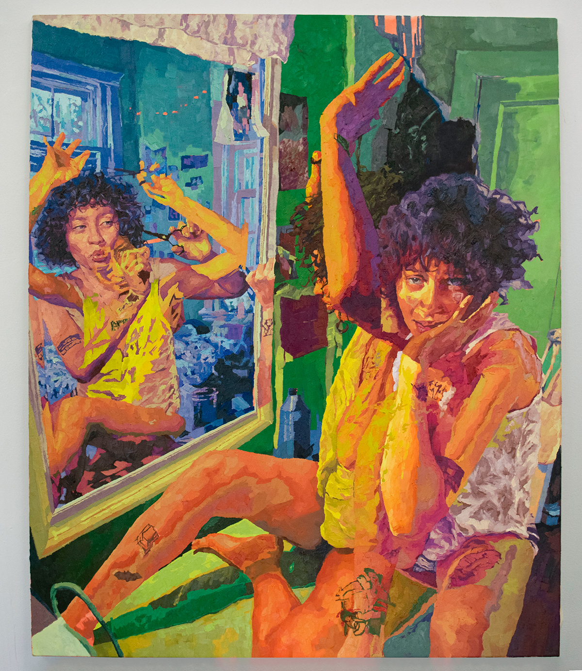 Paintings by artist Lydia Mutone from Richmond, Virginia. Mutone received her BFA from Virginia Commonwealth University in 2021. Her work explores figures within intimate settings and warping memory. She makes use of abstraction, pushing images back and forth via digital editing before transitioning the compilation into oil paint. Playing with legibility and obfuscation, Mutone depicts duplicates of a single subject set in motion yet occupying a stagnant space. Limbs are simultaneously revealed and concealed as figures stumble over one another suggesting both the sense of shifting time and having caught a glimpse of a single mystical moment.
