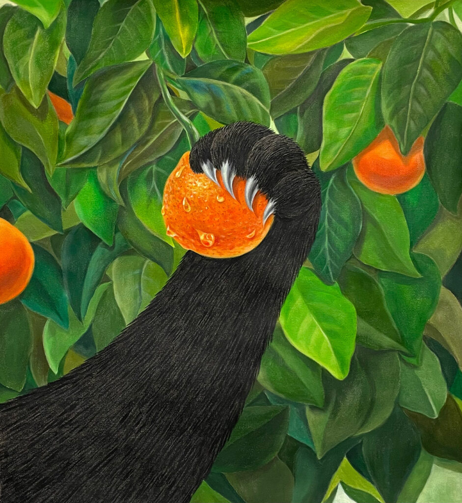 “[The cats] always look greedy and watch every moment that happens in the canvas as if they are God-like beings. They may sometimes symbolise myself, or be cynical images of modern society people. The mixture of these working images can be seen as a mixture of heterogeneity, a dissonance of grotesque characteristics…. The atmosphere of the painting, surrounded by pastel-toned fairytale and fresh colours, makes the scenes in precarious situations seem even more paradoxical.”