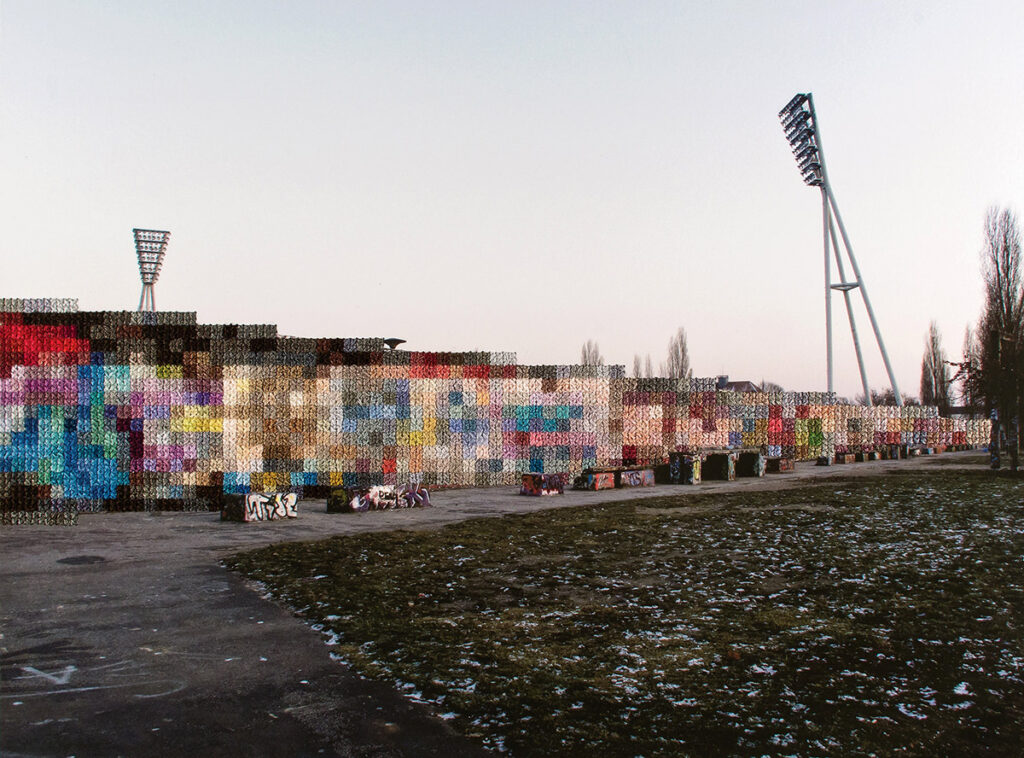 “In many images, the embroidered sections represent the exact scale and location of the former Wall offering a pixelated view of what lies behind. In this way, the embroidery appears as a translucent trace or ghost in the landscape of something that no longer exists but is a weight on history and memory.”