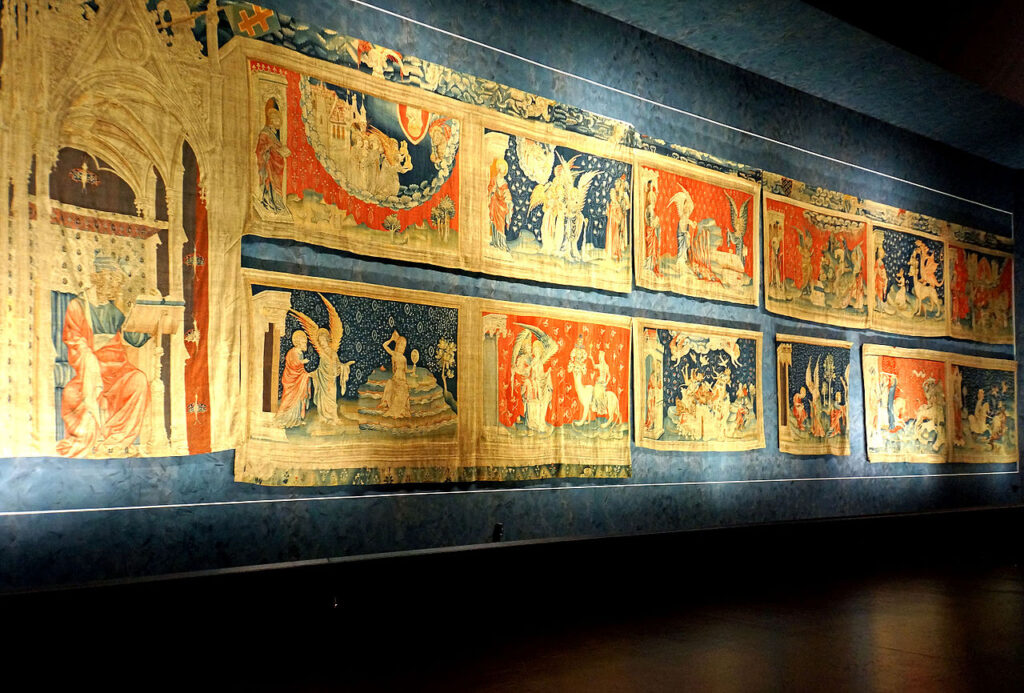 Interestingly, Bondol used an illuminated manuscript as his model. It was later woven in Paris, which was the leading tapestry center in Europe at that time and favored by Louis. It is now on view at the Château d’Angers in the Loire Valley, France.