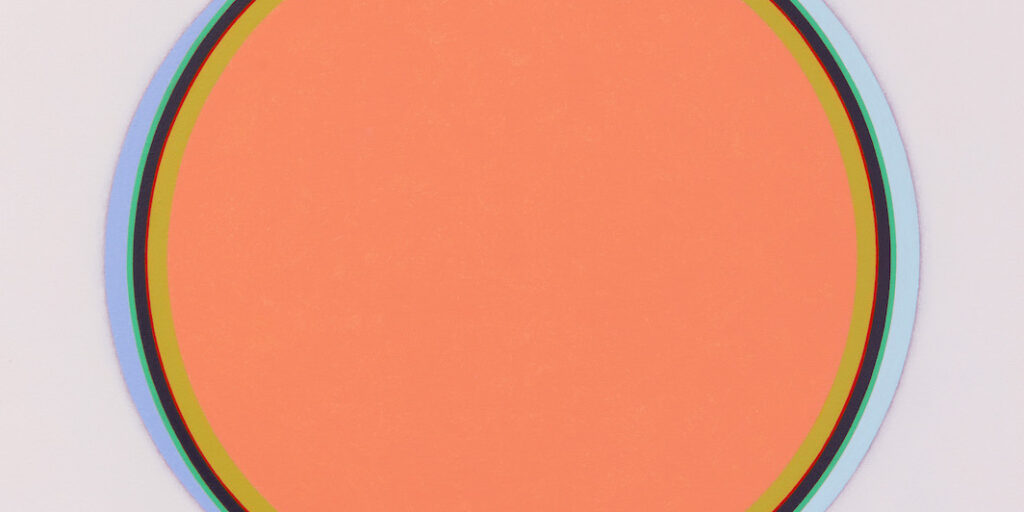 The tradition of concrete abstraction in which Robertson works can perhaps no longer lay claim to contemporaneity, but to focus on this seems to miss the point, and the pleasure, of such work. While the artist’s vocabulary might remind us of an early-twentieth-century theosophical approach to abstraction, the qualities of color and form on offer here provide “an immediate route to the senses,” as the artist puts it, which ensures vitality. In Orange Eclipse, 2022, for example, thin crescents of baby blue skirt the circumference of the central orb, suggesting hidden depths of light and creating a gentle impression of throbbing or thrumming, as if the shape were pressing to become larger than itself. The painting enters our sense of time as well as space—enters the present.