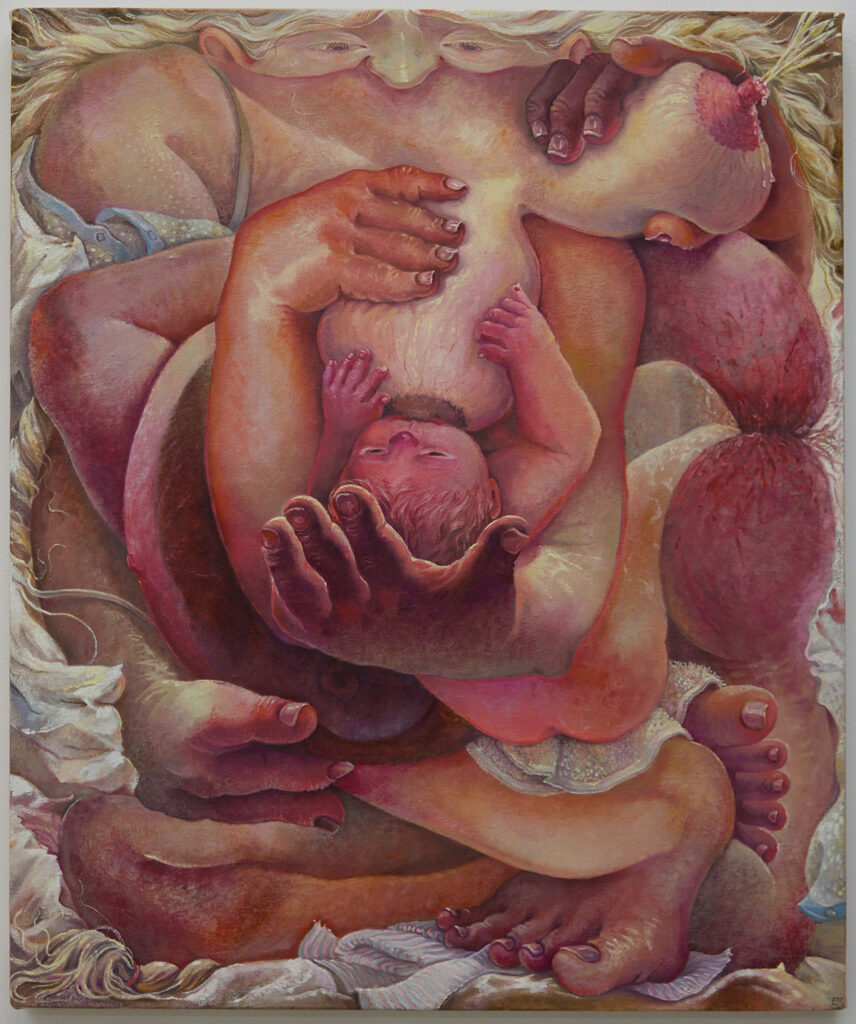 New paintings by Pittsburgh-born, Seattle-based artist Erin Milez (previously featured here). Recently on display at Monya Rowe Gallery, Milez’s latest body of work continues to examine motherhood and the complex physical and psychological changes that accompany it. Milez likens her own feelings of metamorphosis to writer Lucy Jones’s concept of “chimera” in her book Matrescence, which explores the idea that motherhood and pregnancy fundamentally alter one’s identity to the extent that they are never a “singular” being again. Tetsuya Ishida’s work similarly addresses the dehumanizing transformation of labouring tasks, while Amy Adams’ character in Nightbitch literally turns into a dog in response to the demands of creation and mothering.