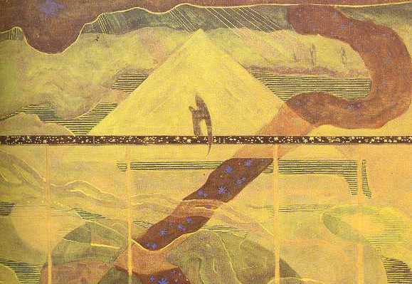 The artist’s initials (MKČ) are easier to find (on the altar in the bottom right corner). The search for SK letters is a bit more difficult. You can finally find them decorating the bridges that connect the mountains. The reason behind putting both of these initials this way remains a mystery as M. K. Čiurlionis rarely explained his ideas behind paintings.