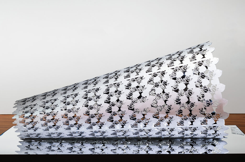 Becoming Sound 2021 (illustrated) on display in ‘sis: Pacific Art 1980–2023’ at the Gallery of Modern Art until 8 September 2024, is a work that demonstrates both the conceptual consistency and technical innovation of Hutchinson’s practice. The work references rongoā (traditional Māori medicine), and through its sleek sculptural form and patterning, it acts as a conduit for the transfer of energy in the healing process. The title highlights the work’s conical form and the way the shape is employed to both concentrate and amplify energy, as one would detect sound via a stethoscope, as a doctor listens to a beating heart, or in creating sound through a musical instrument; however, Hutchinson uses her ‘instrument’ to create a state of soundness — to become well.