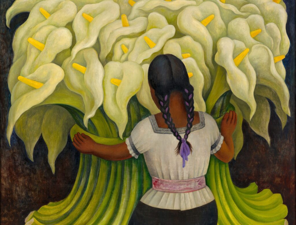 While Diego Rivera is best known for his grand murals, his smaller paintings also carry profound meaning. The Flower Vendor presents a young girl kneeling beside an oversized bouquet of white lilies, their petals bursting outward like fireworks. The contrast between her humble posture and the overwhelming beauty of the flowers speaks to Rivera’s deep appreciation for the dignity of labor. This painting proves Rivera’s ability to elevate everyday people to the level of icons, capturing their struggles and grace with equal measure.