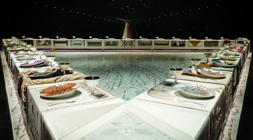 Furthermore, it is composed of 2,300 hand-cast porcelain tiles in the shape of triangles. In total, there are 999 names that share something with one of the women at the table such as the period, region, or contribution. Diane Gelon and Ann Isolde led the research team to choose all the names and place them. Specifically, they focused on the worth of their contributions to society, and especially to the improvement of women’s lives. The names are written in gold luster. It took them two years working with the China Boutique outside Los Angeles to finish the floor.