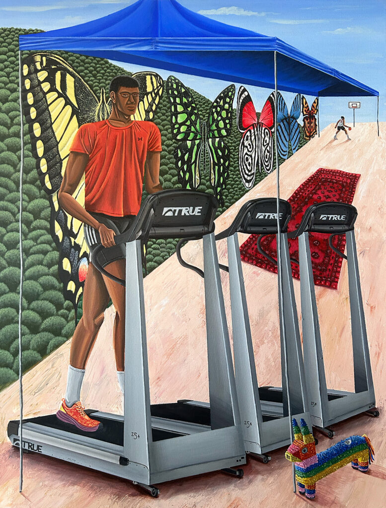 A collection of works reflecting on contemporary life by artist Kingston Poplar. Born in Australia but raised in the UK, Poplar recently relocated to Australia after four years living on a remote Caribbean island. His new series of oil paintings portrays the final period of his life on the island as well as autobiographical moments that open into broader reflections on contemporary existence. Merging elements both real and imagined, ordinary and extraordinary, the fragmented nature of Poplar’s paintings also speaks to the overstimulation of an image-saturated world. Together they offer a meditation on what it means to exist in a digital age full of disconnection and distraction, with each of us existing almost as our own remote island: