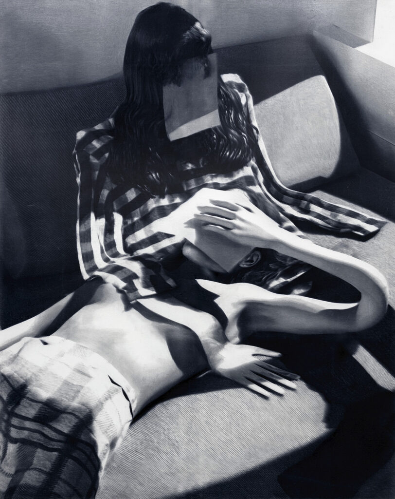 The extension of bodily limits within commercial and digital spaces is exuberantly explored in Justene Williams’s expansive installation and in James Barth’s photopaintings. In Barth’s Gleaming, I’m shown 2021 (illustrated), the anatomy of two lounging, plaid-clothed characters seems to mock skeletal norms. The legless figure sitting in the background is paper-thin, while the arms of a figure lying in the mid-ground appear as malleable as plasticine. To create her artworks, Barth first builds virtual worlds and avatars in open-source graphics software, then transfers these images to silk screens and prints them onto boards in varying shades of grey. The layers of wet paint are then brushed to create a blur — reminiscent of the work of German painter Gerhard Richter — that softens the crisp lines of the synthetic imagery. The resulting artworks are a remarkable combination of the virtual and the painterly.