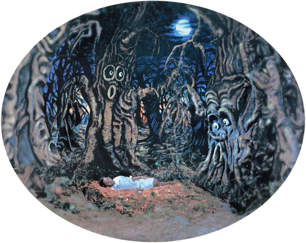 In fairy tales, the line between make-believe and reality is often blurred. In Tracey Moffatt’s screenprints from her ‘Invocations’ series the artist explores the collective fear of abandonment and vulnerability at the heart of many ‘lost children’ fairy tales. Both eerie and inviting, watchful trees trace the movements of a young girl deep in a sentient European forest, recalling the aesthetics of twentieth-century fairy-tale cinema — from Walt Disney Studio animations to The Wizard of Oz (1939). Moffatt’s process, too, treads the line between fact and fiction, with photographs screen-printed, layer by layer, to resemble the texture of a painting. The uncanny imagery of these works prompts questions about race, colonialism and belonging in different landscapes.