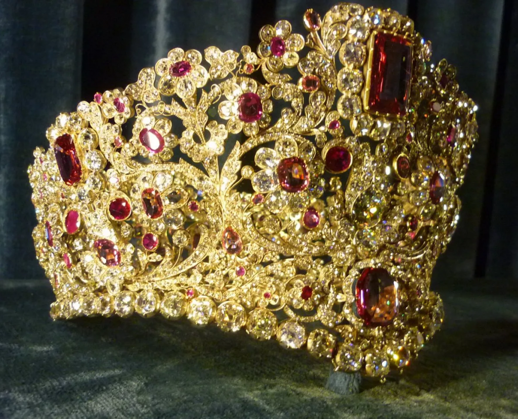 Since we’re hopping around Europe the time has come to visit Sweden. This tiara is interesting because unlike every other one in this article, it does not have a single gemstone in it. It is made of steel that has been strategically cut, polished, and set in gold. Thanks to this inventive design it does not lack the sparkle. The tiara is said to have been made for Empress Joséphine’s daughter, Hortense de Beauharnais. Beauharnais had no daughters, and it’s generally believed that she gave her steel jewelry to her niece, Joséphine of Leuchtenberg. When Joséphine of Leuchtenberg married the future King Oscar I of Sweden in 1823, the steel sparkler apparently traveled with her to her new home in Stockholm.