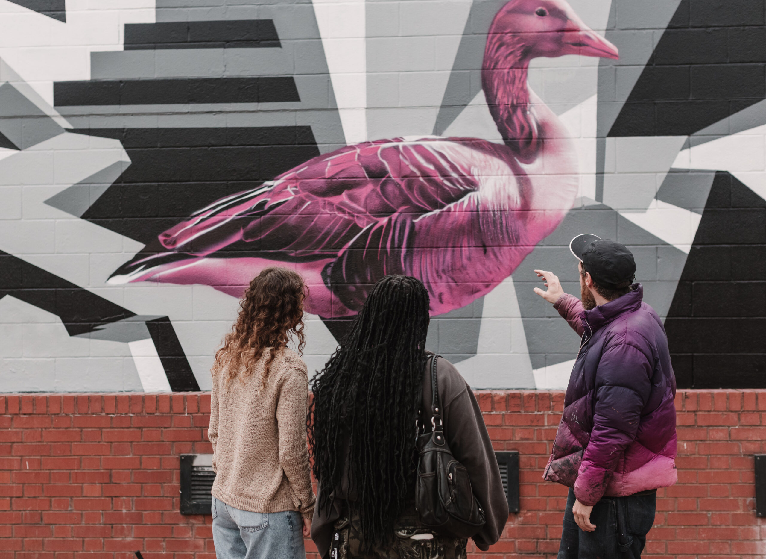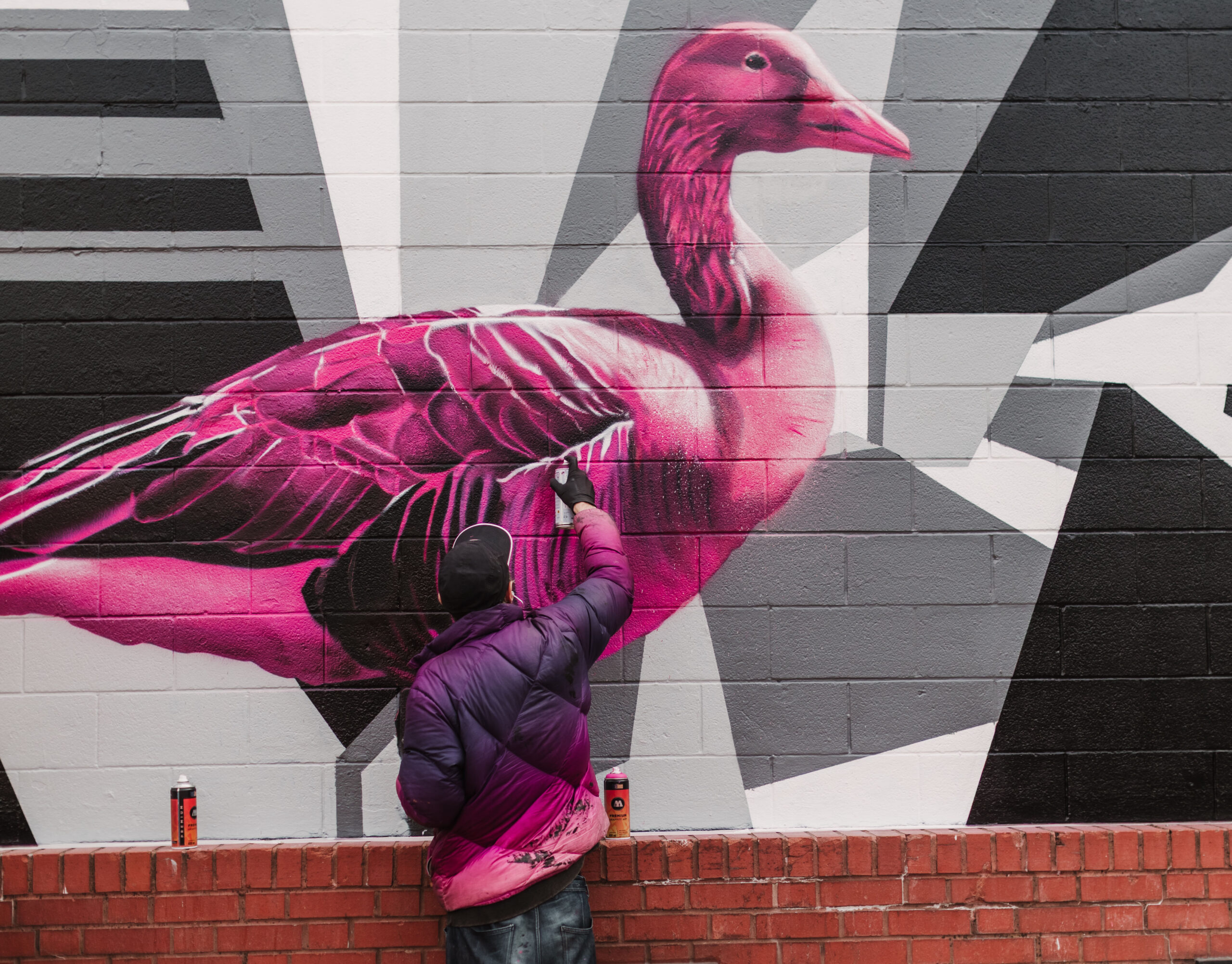 “This mural is a true collaboration,” says Speed. “I spent over 60 hours on campus, connecting with faculty, students, and the wider community to understand what Warwick means to them. The geese felt like the perfect metaphor, social, migratory, always returning to a temporary home.”