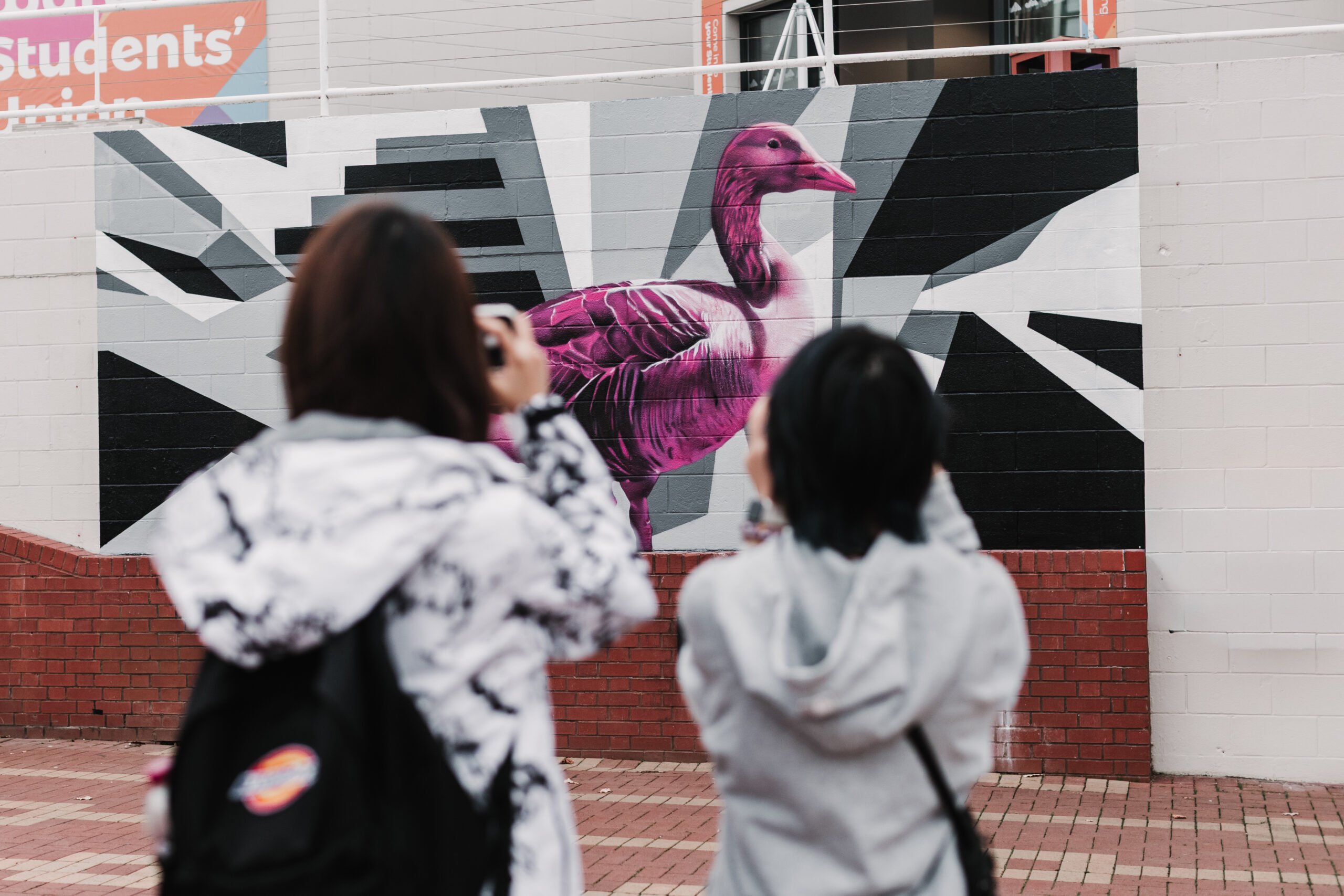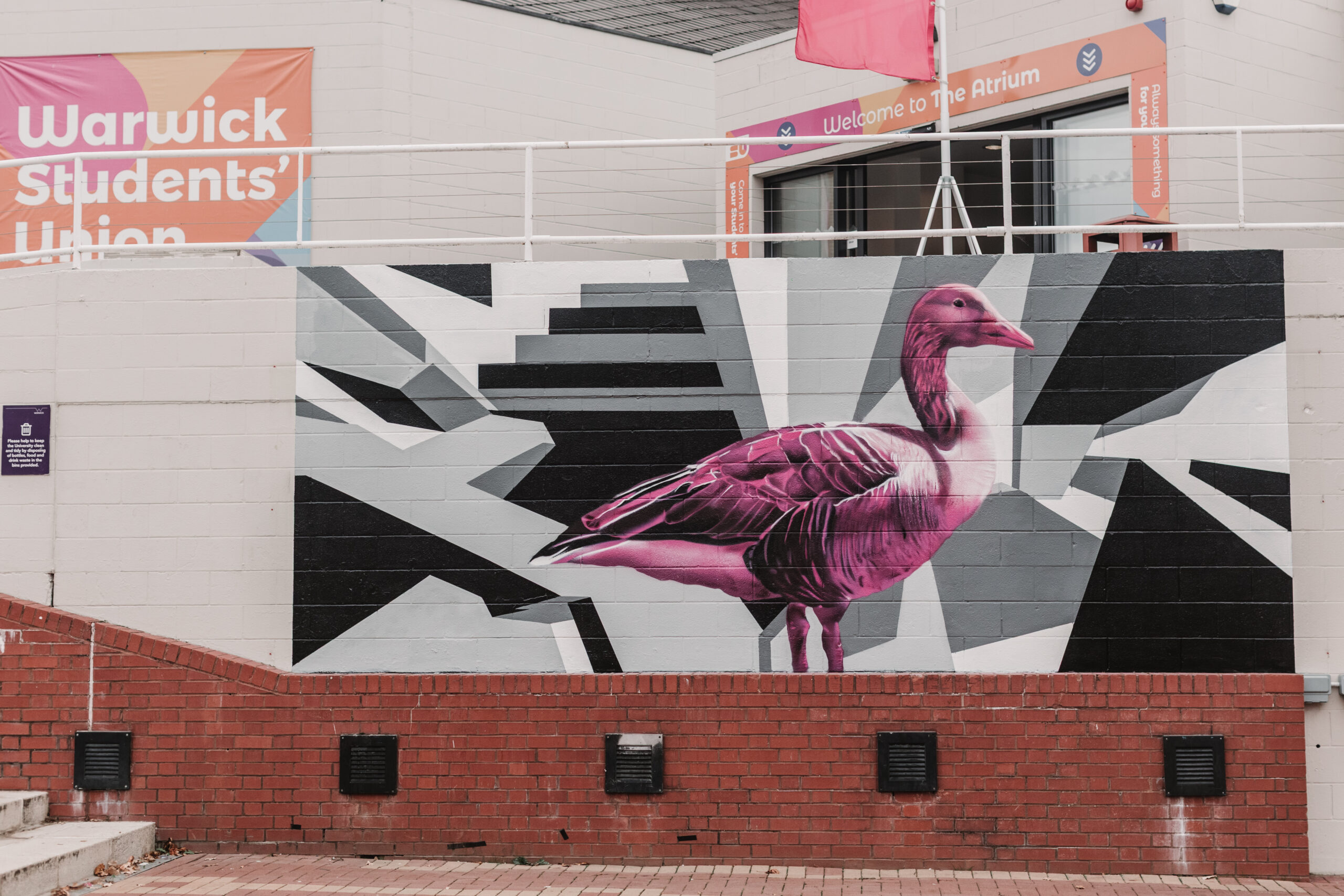 Created during Warwick’s ‘Welcome Week’ (29 September – 3 October), the mural celebrates the University’s 60th anniversary through collaboration and light. Drawing inspiration from the campus’ greylag geese, beloved mascots and icons of student life, Speed reimagines the bird as a geometric, luminescent figure soaring across the façade.