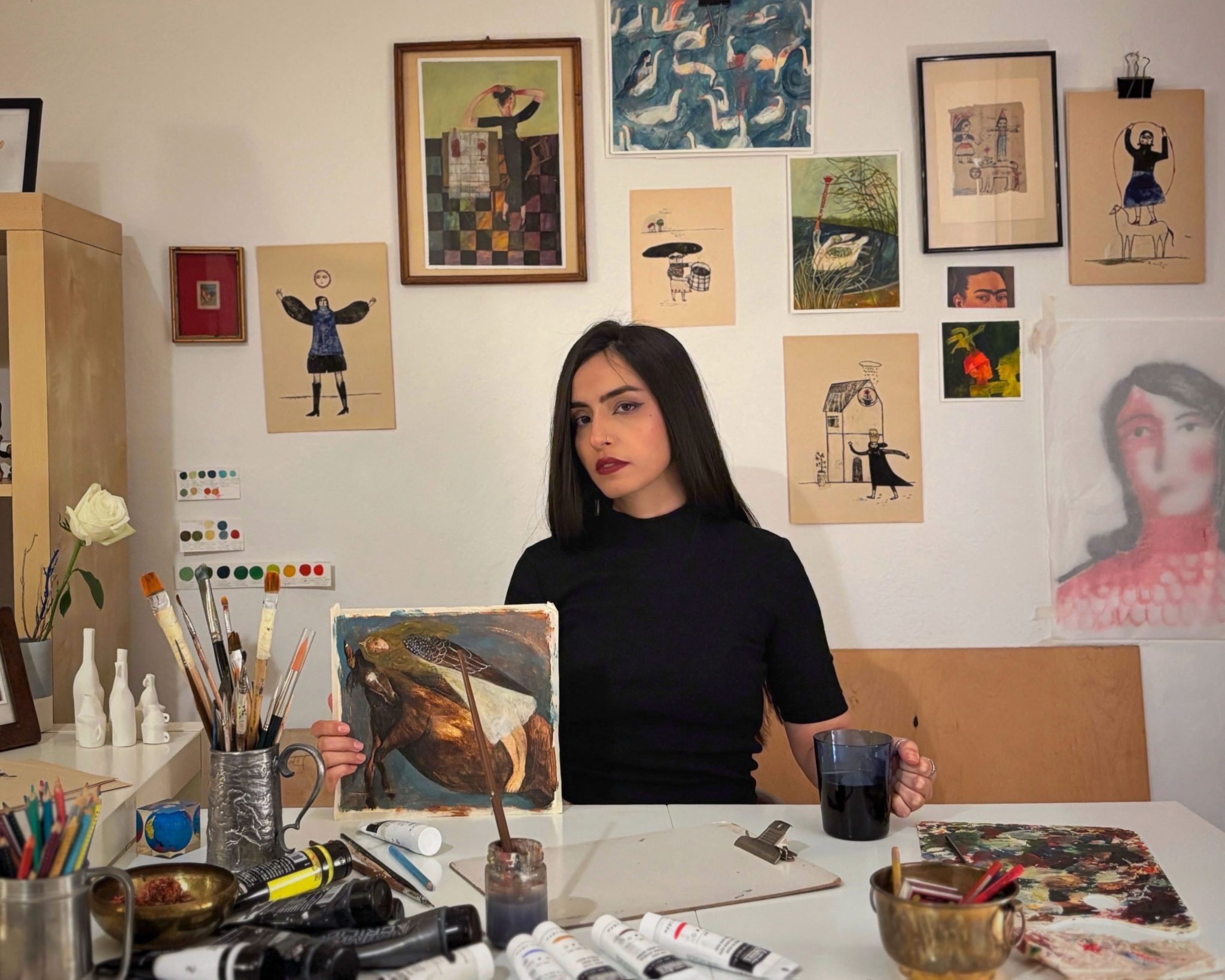 My studio is very small, and I work within this limited space, though I hope one day to have a larger studio. Even so, I have transformed this small environment into a calm and controlled space, where order and chaos coexist. Around me, the walls and surfaces are filled with my works, sketches, and experiments—from fabric sculptures to collages, printmaking, and acrylic paintings. I try to keep all materials and techniques within reach, so that I can bring each idea to life in the best possible way. Sometimes I work with music, letting its rhythm guide the flow of my process, and other times in silence, especially when my mind is full of ideas. This intimate environment allows me creativity to flow freely, letting imagination, memory, and emotion shape every brushstroke with focus and freedom.