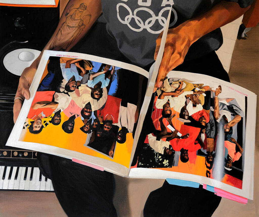 A selection of paintings exploring familial ties and intergenerational connection through music by Los Angeles-based artist Jacob Rochester. Rochester’s work ranges from photorealistic to gestural mark making. His latest solo exhibition, “Input/Output,” reflects on shared points of recognition. Filtered through time, sound, and lived experience, the work expresses a sense of nostalgia not to a specific era but rather to the things (people, music) that have left a positive imprint. Working primarily from photographic sources—both personal and found—Rochester selects, crops, and alters images much like a music producer isolates and mixes beats or chords. He builds his compositions through a combination of sketches, gouache studies, digital manipulation, and an oil painting technique inspired by Titian, in which layers of colour are glazed over a monochromatic underpainting.