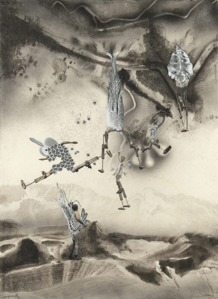 James Gleeson (21 November 1915–2008) was one of Australia’s most recognised and celebrated Surrealists, particularly influenced by the works of Salvador Dali, Max Ernst, and Rene Magritte. He began his career in the 1930s, establishing himself as both a painter and a poet. By the mid-1970s, he found less time to paint due to his writing projects and responsibilities as an advisor to the National Gallery of Australia. With little time to make art, Gleeson began experimenting with collage.