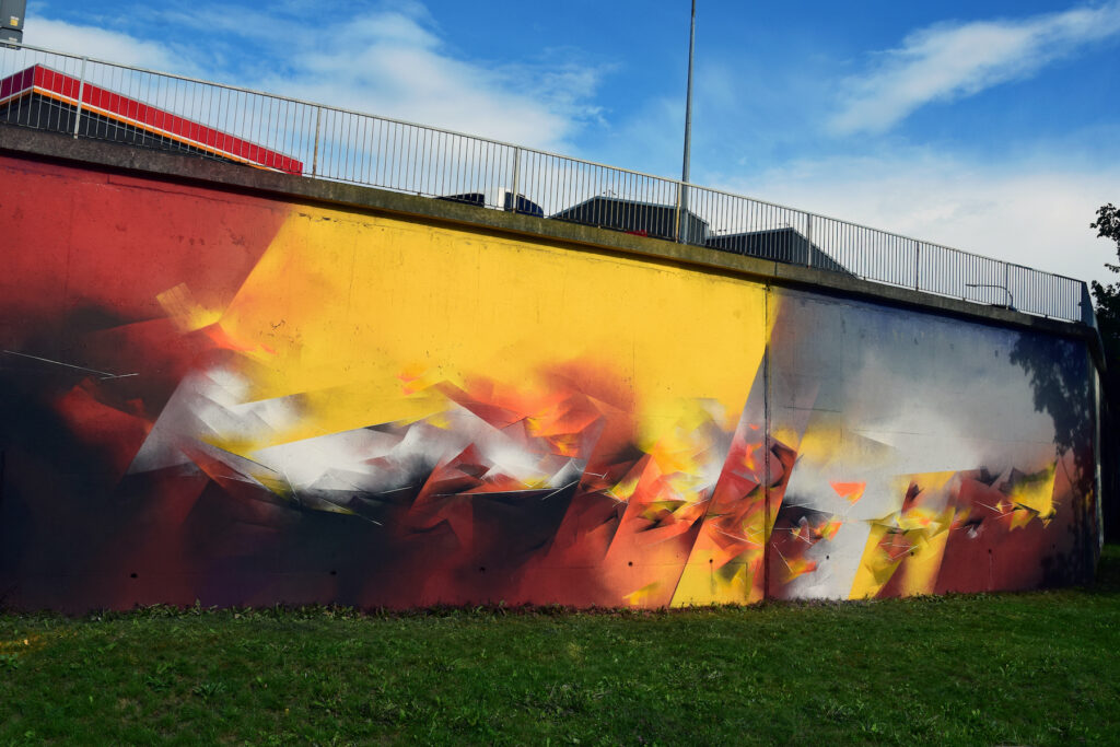 Bartek Świątecki’s aka Pener work mixes abstraction and traditional graffiti. Great detail and color transitions create a fluid composition with layers and layers of deconstructed form. High art and youth culture, modernism and skateboarding. His images are based around geometric groupings and angular forms which reference futuristic architectural design.