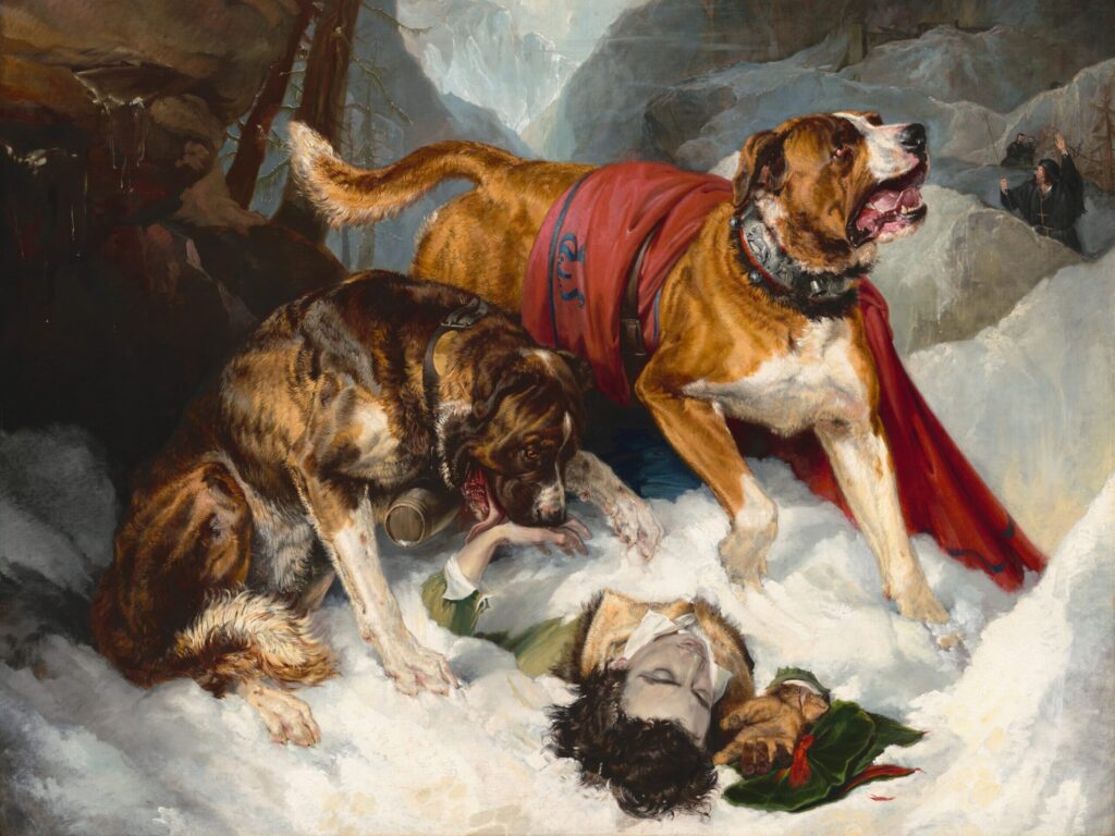 Edwin Landseer had never travelled to the Alps, but it’s clear that tales of courageous dogs would have appealed to him due to his strong affection for animals. Landseer’s painting became another narrative in the Alpine rescues genre, which grew to the point where myth overtook fact in some cases. For instance, St. Bernards never carried barrels of brandy around their necks. This is a fiction Edwin Landseer invented with this painting, and the image lived on in popular culture.