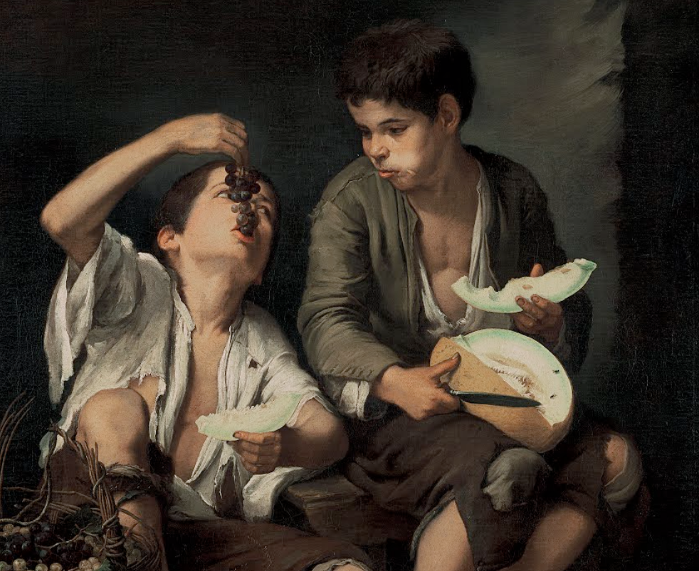 Both the lighting and the brushstrokes are soft, bringing to the painting a gentleness and a sweetness characteristic of Murillo’s work. The lighting, which arrives from the left of the painting, forces the viewer to focus their attention on the boys. It does so by emphasizing the few points of bright color in the painting: the left boy’s shirt and the melon on the lap of the other one. This lighting reminds us of the treatment used by Caravaggio. Murillo certainly knew of the Italian school, since this is not his only painting where we can see this influence.