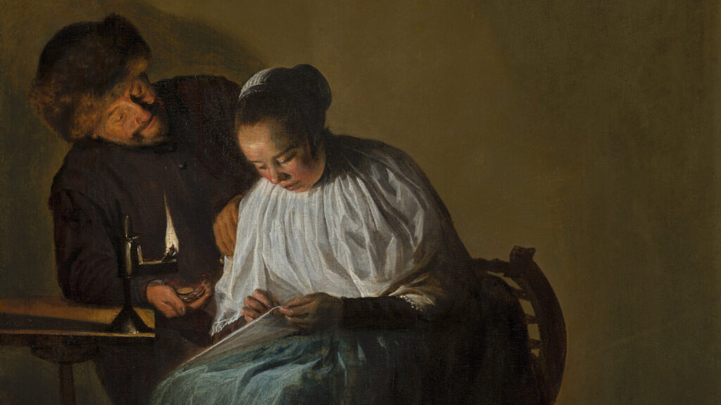 Judith Leyster was a master of visual arrangement. She punctuates Man Offering Money to a Young Woman with diagonal visual lines that add movement to the immobile scene. The lines are too accurate and too intentionally placed to be coincidental.