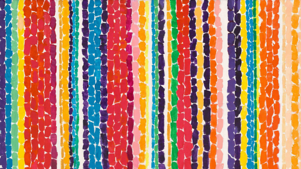 Alma Thomas uses her natural inspirations to collect their hues, patterns, and movements for her paintings. The brushstrokes are like individual flowers swaying in the wind. There is a rhythmic play between stability defined by the rows, and instability defined by the individual element. Order and disorder rhythmically play together.