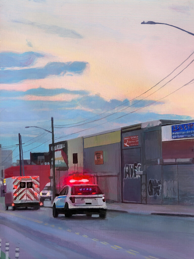 “At the end of 2021, I packed all my possessions into my 2002 Subaru Forester and drove across the US from Utah back to New York City. It was a bittersweet time: the end of a relationship and a job I loved, silver-lined with the sense of new beginnings and the thrill of the unknown. The swiftly moving American highway seemed to mirror my internal wrestlings of freedom and heartbreak. Passing through deserts and plains alone, I felt connected to a greater collective memory of the American landscape and the people that have passed through before me. How and where, precisely, does the personal tap into the universal? Why is it that we feel a certain pang driving by a desert gas station at twilight? And how can atmosphere and color engage our emotions? Resuming life as an artist in the city, I began to explore through painting that state of wonder I felt as a transient observer just passing through. A friend recently recommended a film by Hong Sang-soo called “On the Beach At Night Alone” (2017). The words of the protagonist spoke to my experience as she described her travels abroad: ‘Sometimes the loneliness made me tremble. But there’s pleasure in that too.’”