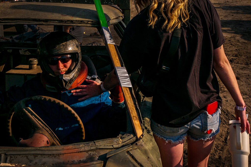 “Immersing myself in this circuit allowed me to move beyond the spectacle of the events and into the lives of the drivers and their families. Through conversations and shared time, I began to understand what draws them to this sport: tradition, resilience, community, and the preservation of a way of life passed down through generations. Demolition derbies, like many forms of motorsport, are frequently reduced to stereotypes associated with working-class or ‘redneck’ culture. While I often found myself at odds with the political views expressed within these spaces, the project resists caricature. Instead, it seeks to portray the complexity of the people involved—individuals who are hardworking, generous, deeply committed to family, and proud of their communal bonds. By focusing on moments both within and beyond the arena, this series explores themes of identity, class, and belonging, challenging preconceived notions of Americana and inviting a more nuanced understanding of a subculture shaped by grit, care, and connection.”