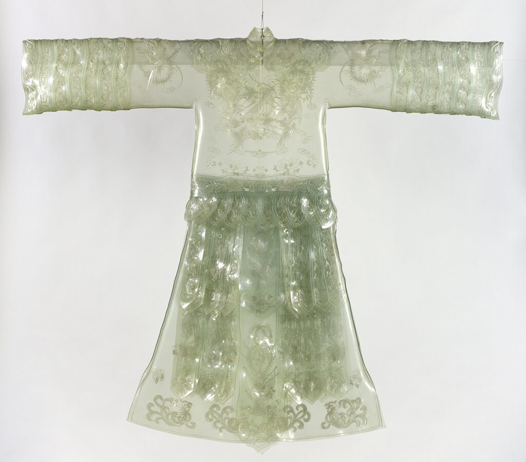 Chinese artist Wang Jin’s Robe 1999 renders the iconic form of the Peking Opera robe in transparent plastic embroidered with fishing line (illustrated). The juxtaposition of a traditional high-cultural form and modern synthetic material refers to transformations in Chinese society, most pointedly the rapid evolution of consumerism. Robe is on display within the exhibition ‘I Can Spin Skies’ at the Queensland Art Gallery’s Henry and Amanda Bartlett Galleries (5 & 6).