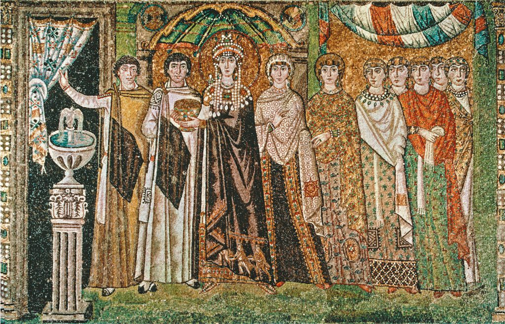 A similar mosaic panel on the other side of the apse depicts Theodora and her retinue of male and female courtiers. Elaborately dressed, she carries the chalice for the Eucharistic wine. The women that accompany her, including one who may represent Belisarius’ wife – Antonina, also wear rich and elegant clothing. Unlike the Justinian mosaic, which appears on a solid gold background, Theodora’s group stands in front of an architectural niche. There is a fountain to the left side of the composition, and one of the male courtiers holds back a curtain so she can pass through. Both Justinian and Theodora appear with halos, usually taken to refer to their supposed divine right to rule, rather than to any claims of sainthood.