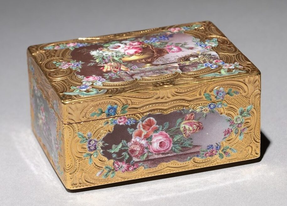 While the earlier forms of snuffboxes were humble objects crafted from wood, horn, and metal, over time these practical containers transformed into symbols of wealth and refinement. Artisans across France, Germany, England, and Switzerland employed luxurious materials such as gold, enamel, ivory, and porcelain to craft intricate and elegant works of art showcasing remarkable craftsmanship.