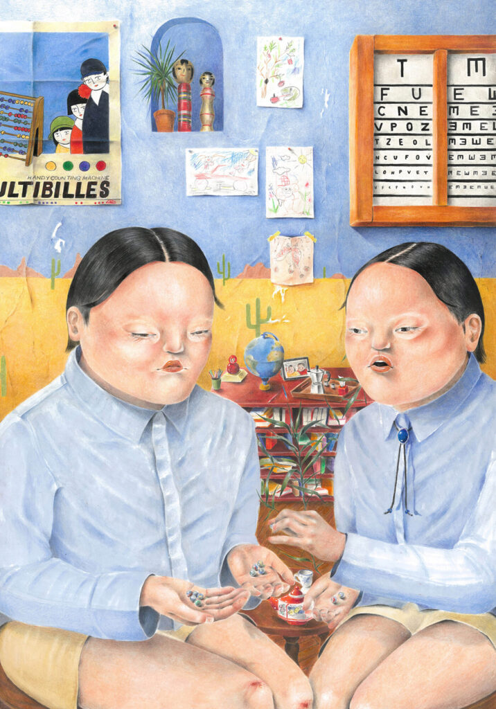“With my coloured pencils, I tend to stage showy and colourful characters in surrealistic scenes tinged with melancholy and humour. Asian mythology and folklore deeply imbues the roots of my art. The work’s progression rely on a long process of intuition, researches and patience.”