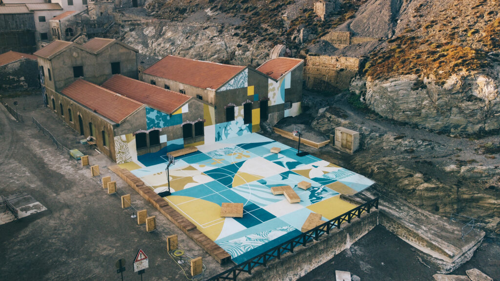Italian artist Tellas has just completed a new project in Argentiera, Sardinia, Italy. Entitled “FronteMare” this piece is a collaboration between Tellas, Puerto Rican artist 2Bleene and the architects from Landworks, who transformed a huge parking lot to a new area that works as a plaza and basket/pickleball.