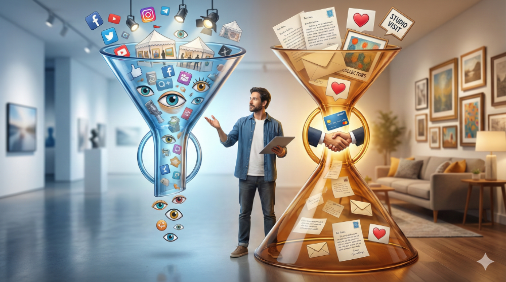 If you stop thinking about the process the moment a sale is made, you are leaving the vast majority of your potential revenue on the table. To build a sustainable, lifelong art career, we need to visualize not just a funnel, but an hourglass—a Double Funnel.