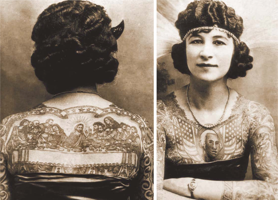 Around the neck was observed a floral necklace. Dependent from this was a bunch of roses in full bloom drooping until their graceful forms were lost beneath the lace edging of the bodice. The rising sun was illustrated on each shoulder and the arms were covered with stars, hearts, floating angels, wreaths, harps, crosses, a full-rigged ship, and various mottoes. The young woman’s back, it was said, was completely covered with a large cross, heart, and anchor. Upon the lower limbs were pictures very numerous and complicated.