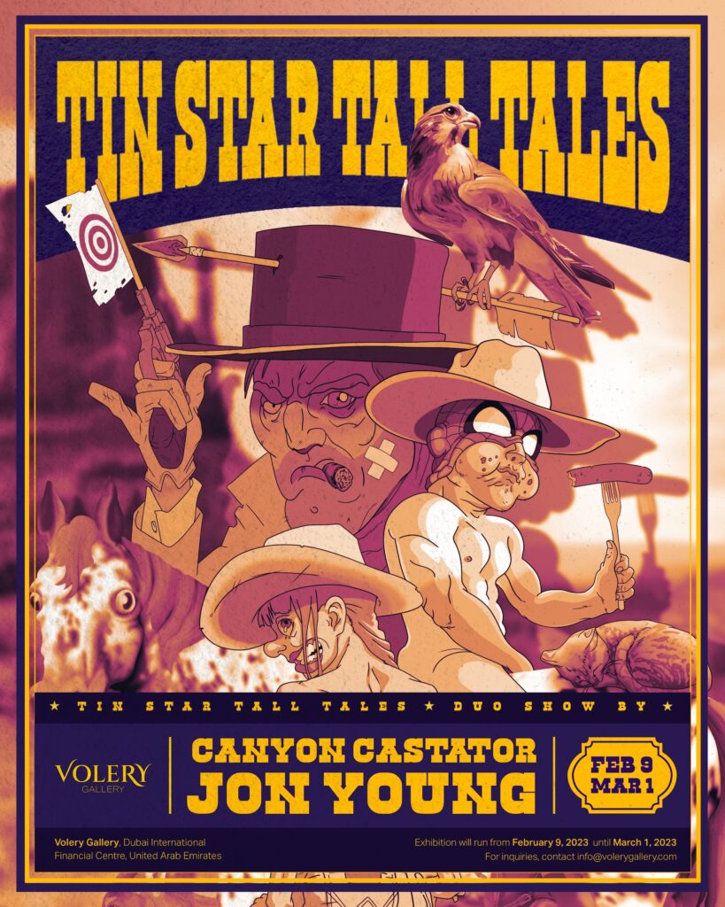 Volery Gallery presents Tin Star Tall Tales, a solo exhibition featuring Canyon Castator and Jon Young this coming 9 February to 1 March 2023. The show challenges our understanding of the American identity through wall works and sculptures. Using different mediums and techniques the artists explore the ways in which the American West Mythology has been constructed and perpetuated, and its relation to issues such as nostalgia, Indigenous erasure, and the glorification of violence. Both artists also draw inspiration from their own experiences and perspectives, with Young referencing his Indigenous heritage and nomadic upbringing, and Castator drawing on his childhood’s experiences.