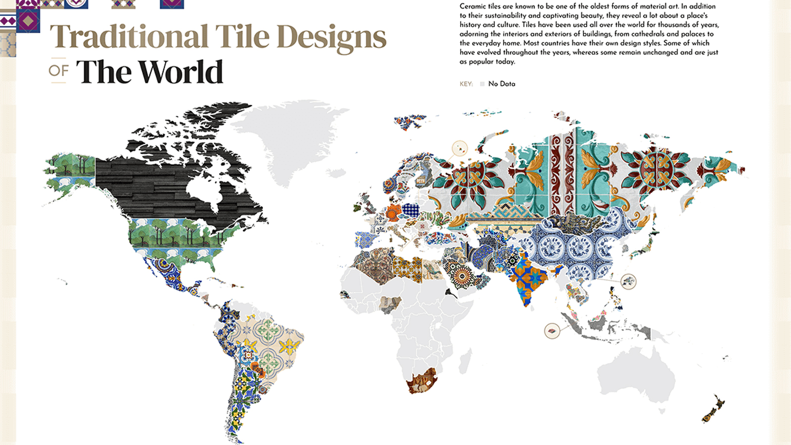 The tile designs appear in a series of maps with tile patterns superimposed over the countries, an illustrated list, and a slideshow searchable by country or continent. What this project lacks, however, is information. After catching the viewer’s interest, the website gives little opportunity to learn about the tile traditions included. That is not too bad when there is a specific name you can Google (Korean Goryeo tiles, for example), but others are too vague (googling “Nigerian Broken Tiles” got me nowhere). Nor do we learn much about how and why each pattern was chosen to represent its nation. The website mentions sources ranging from scholars to blog entries to social media posts, but the few links given tend more toward the commercial than the educational.