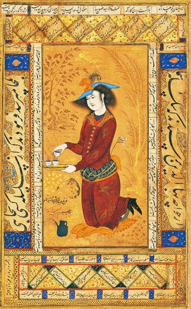 One of life’s best sensations may be to get home after a long day of work and indulge in some good tea (or, in my case, coffee). Enjoying a cuppa alone with your thoughts gives an extra charge of energy that we all need. In Saki, Reza Abbasi shows a girl in red robes who is holding a tray with three cups of tea. She’s probably holding a girls’ night and making some tea to keep them going all night long.