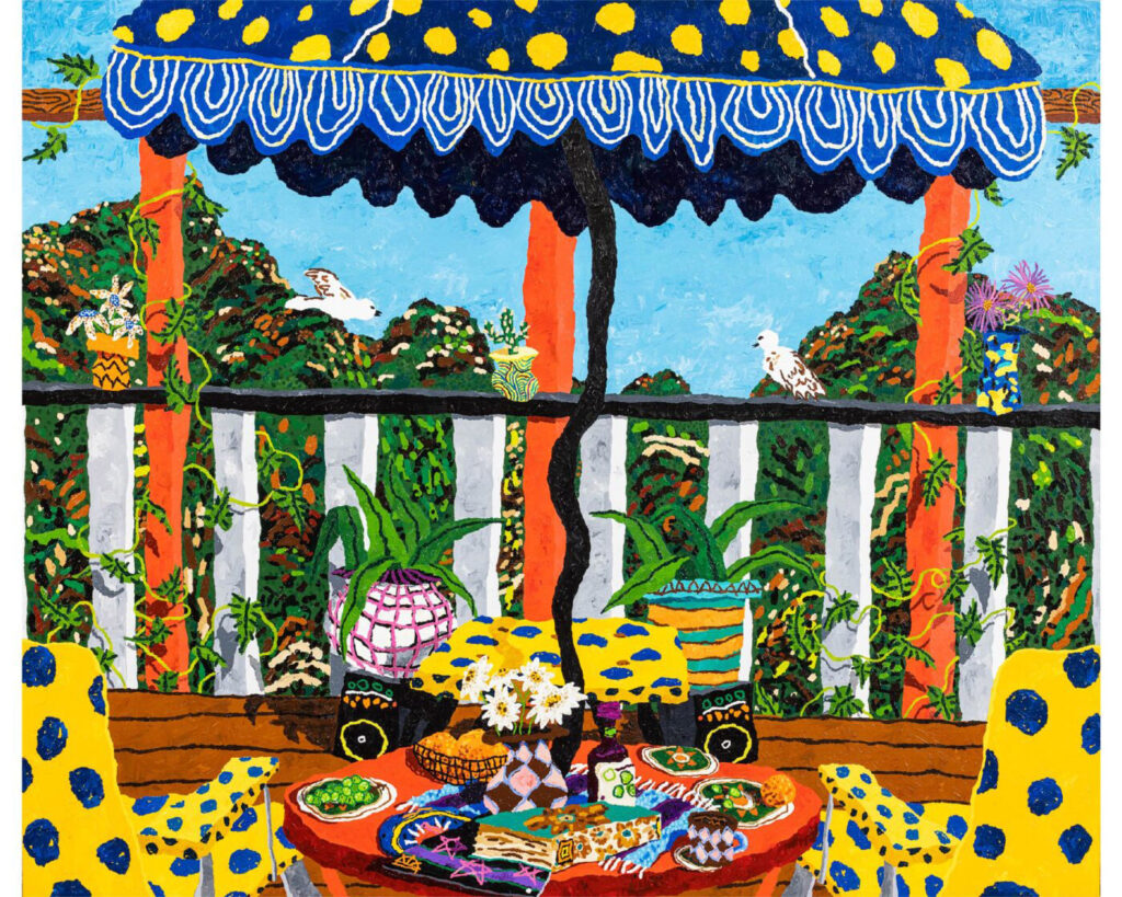 A new selection of paintings from American artist Cooper (previously featured here). Recently exhibited with Maddox Gallery in Switzerland, “Wild Life” offers reimagined scenes of domesticity infused with new patterns and an expanded colour palette. His still lifes feature a range of objects — vintage record players, speakers, piles of books, plants and mid-century furniture — that represent the joy he finds in the minutiae of the everyday, past memories, and dreams for the future. Check out more images below!