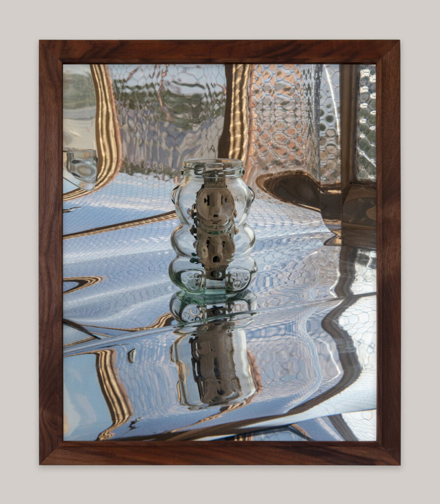The photographs depict reflective forms (jars, shards of pottery, a deadbolt lock) set upon or lodged into reflective surfaces (mirrors? Mylar?) picturing glass and sky. While each image has at its center a distinctive and absurd object (a pair of pareidolically stacked electric sockets, a shell jammed into a keyhole) what captures one’s attention is not necessarily the cardinal subject, but the surfeit of surfaces all around.