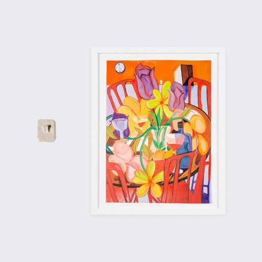 “The print is about community, or close friends, gathering. I was thinking a lot about summer approaching and the energy of having friends over. The flowers are blossoming, and glasses are on the table. Things are ready to get poured. So that shared space is in the energy of this print.”