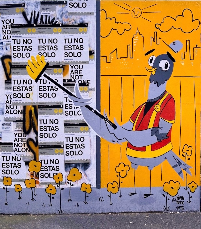 This past May, a wonderfully diverse group of artists brought their skills to South Street Seaport, marking the third year that the You Are Not Alone community-based art project curated a huge 160 ft long wall in honor of Mental Health Awareness Month. These murals’ message of hope is particularly timely this month, September — National Suicide Prevention Month. Featured above is the work of the Washington Heights-based graphic designer and illustrator Yuma York. Several more images from this year’s You Are Not Alone Murals Project 2024 at the Seaport follow: